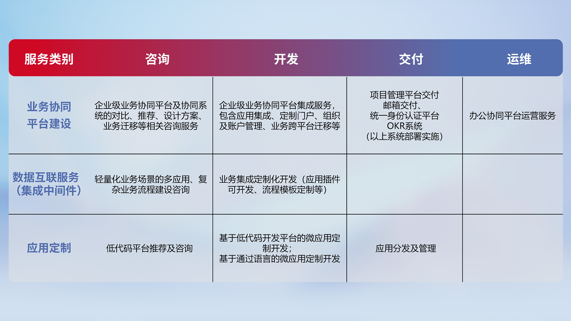 针对钉钉、、、、企微、、IDaas等平台级产品提供产品的规划、、方案、、、交付、、、、定制化开发等服务,,,实现如统一协同办公、、智能客户服务、、、混合会议管理、、智能数据查询、、、、等业务场景,,,,实现数字化转型。。。。